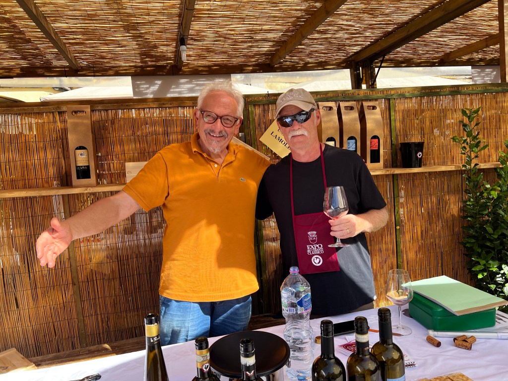 We even ran into a winemaker that we had met (when he was just selling out of his basement) back in 2009 or 2011. Le Stinche (pronounced Le Stinky) has branched out to several wines since then. He didn’t remember us, but there was no mistaking him. We have a photo from then that looks pretty much exactly like this: