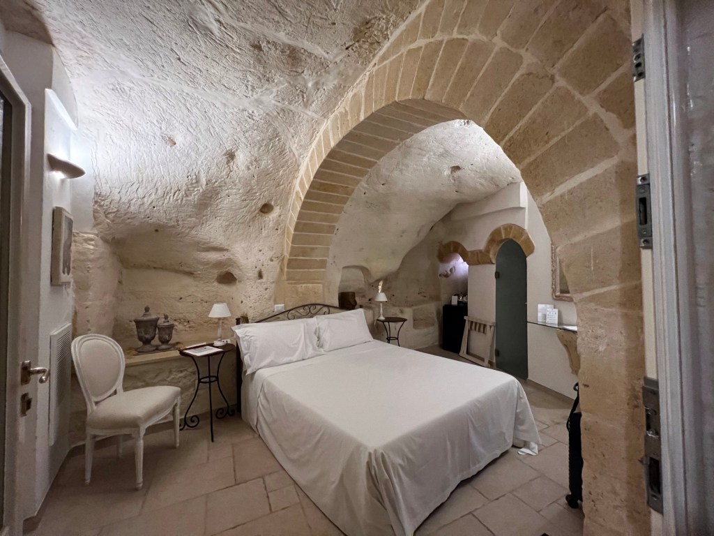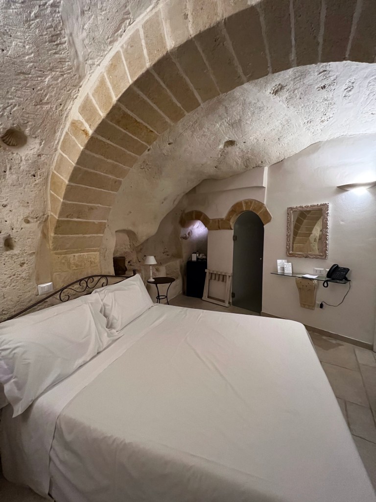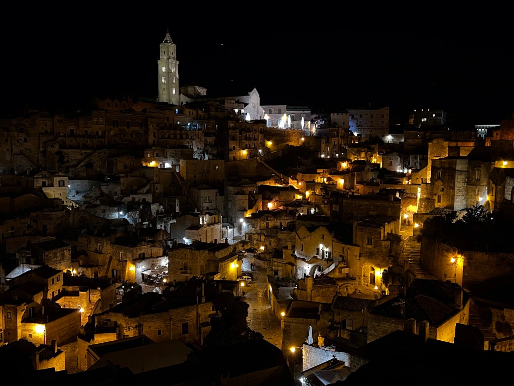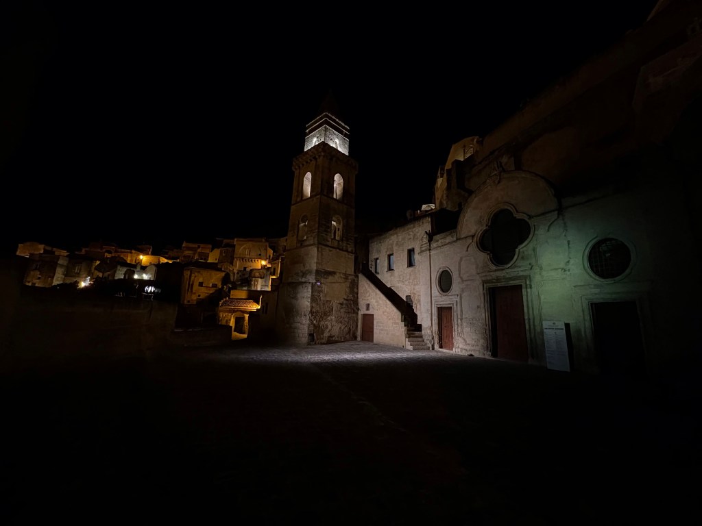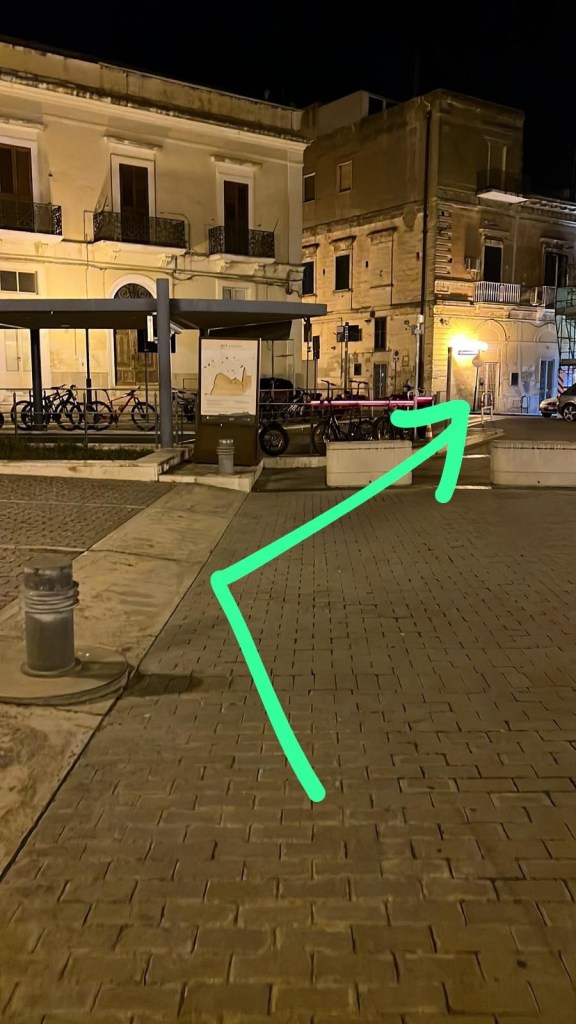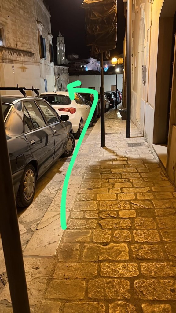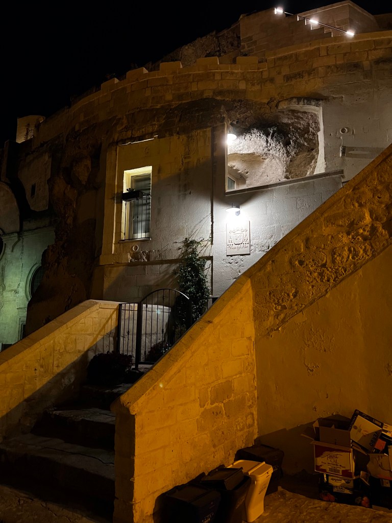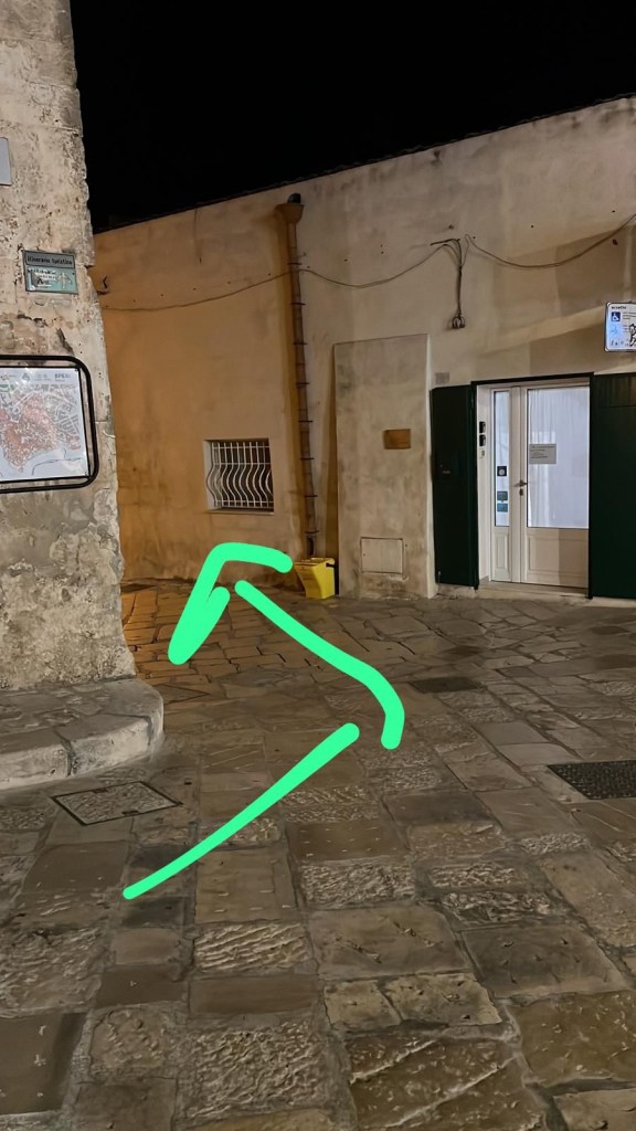 By this time, we were starving to death. Luckily, the Italians eat dinner much later than we do, so although our little bistro was closed, the guys assured us that we would find restaurants open nearby in the old town. So I dropped a pin of my own on google maps, hoping it would help us find our way back home, and we headed out. Not for away we saw a restaurant and gratefully got two lasagnas with tiny meatballs and a bottle of Primitivo – the local wine. Both were excellent and we tumbled back down the hill to our beds. Tomorrow we have booked a private walking tour of the caves and old town and even though we don’t usually do tours of anything, this one is going to be worth its weight in gold just to have someone know where we are going and how to get back. Oh, and know the amazing history of this place – that too. And our tour guide is named “Cosimo”! What could possibly go wrong? (Seinfeld reference there for anyone who may not have watched it back in the day.). I will leave you with a photo of the church next door, which thankfully does not ring bells at an ungodly hour.
